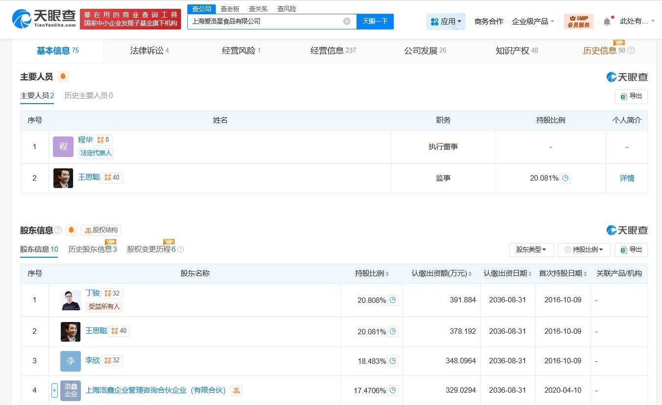 该公司成立于2016年10月,法定代表人为程华,注册资本约1883万人民币,经营范围含食品流通、从事货物及技术的进出口业务、企业管理咨询、企业形象策划等。主要人员信息显示,王思聪在该公司担任监事,股东信息显示,王思聪持有该公司约20%股权,位列第二大股东。