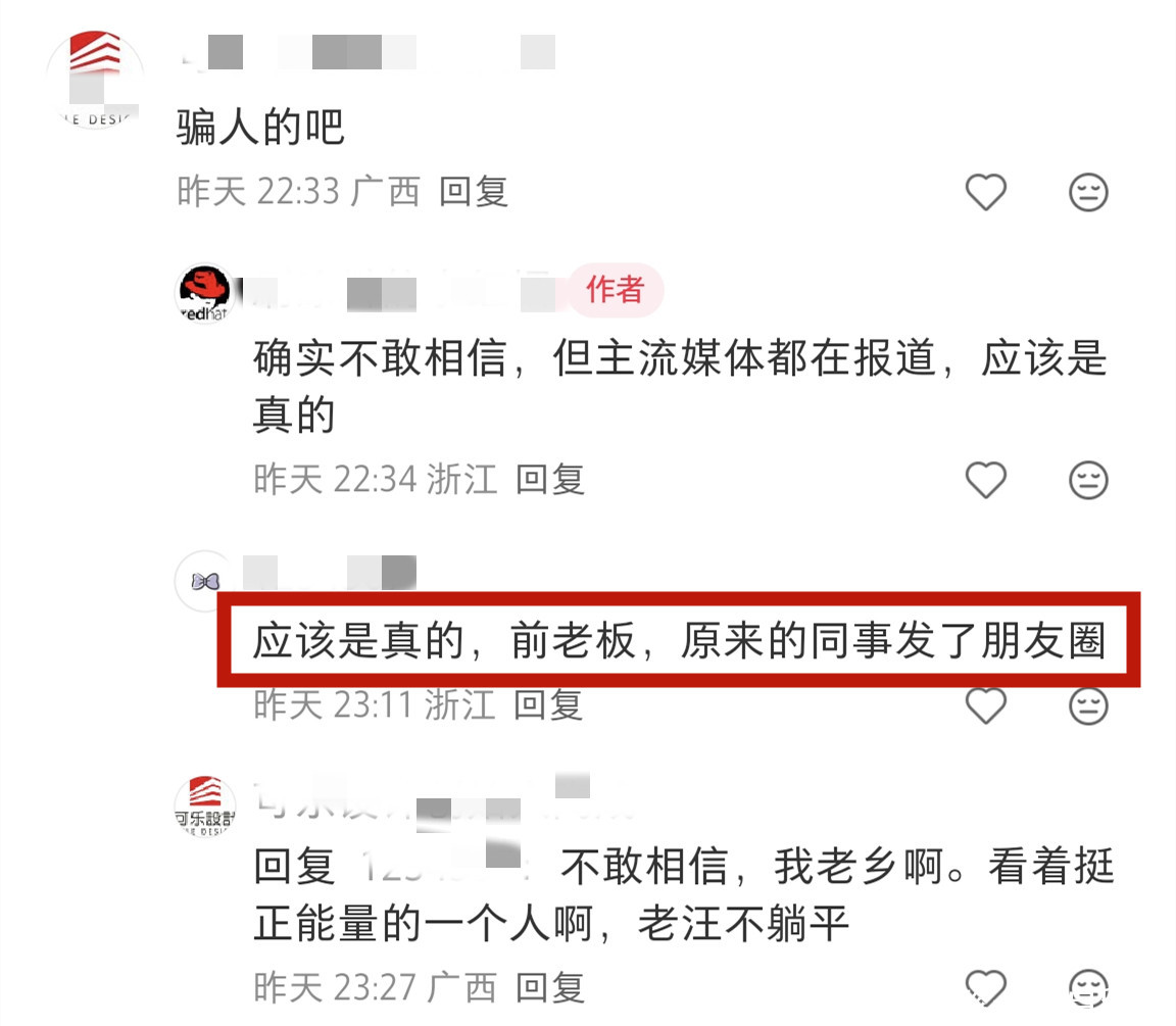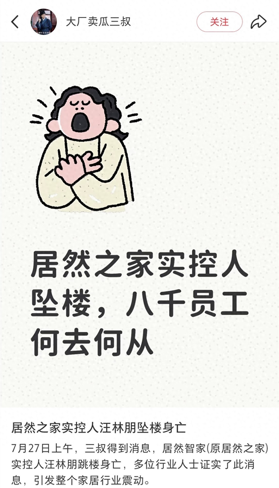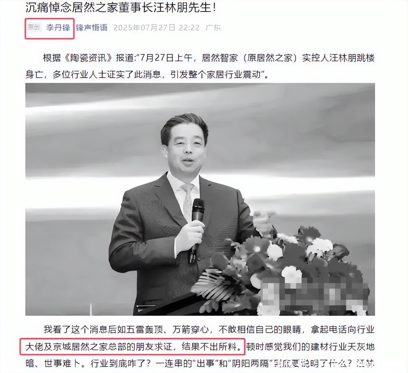 得知此消息之后,笔者也在网络查询,发现有居然之家的前员工发文说,还在居然之家工作的同事在朋友圈发文透露了汪林朋跳楼身亡的消息。