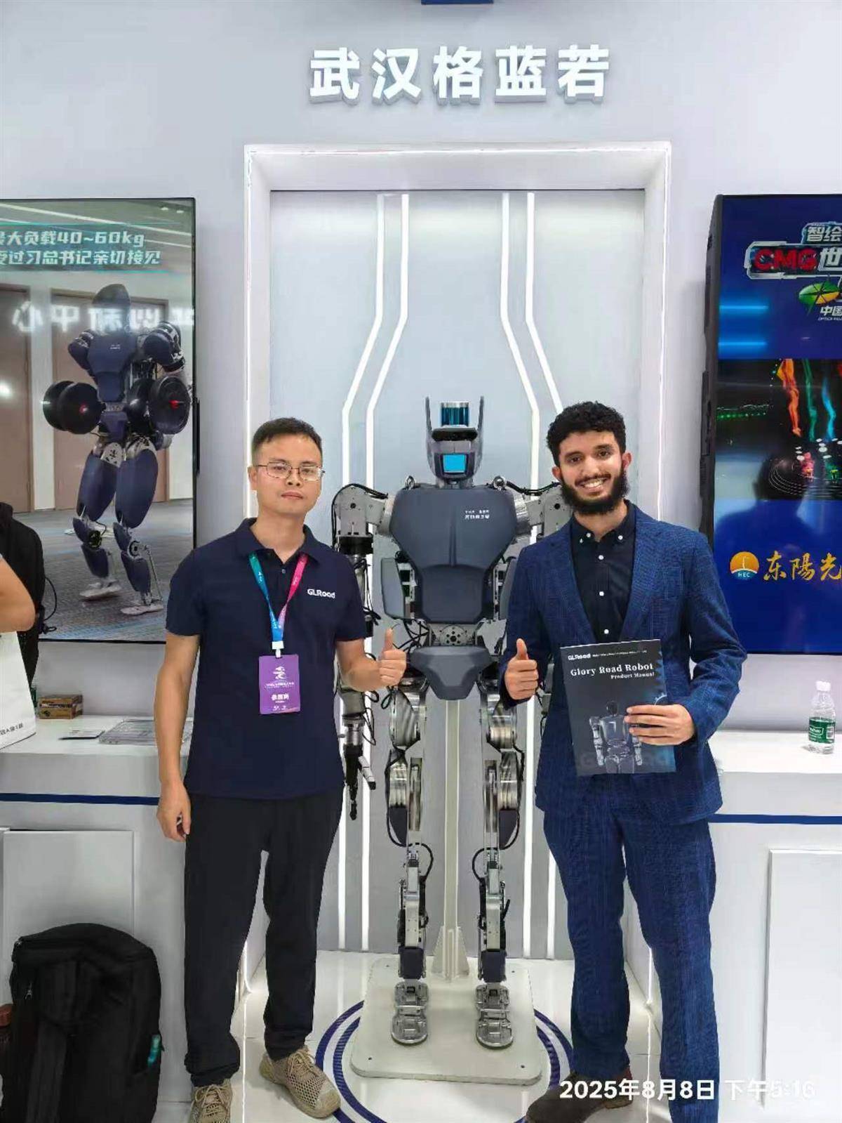 8月8日,在世界机器人大会上,来自沙特阿拉伯的观众在了解到“大壮”双臂负载40kg能力后,对机器人竖起了大拇指。(受访单位供图)